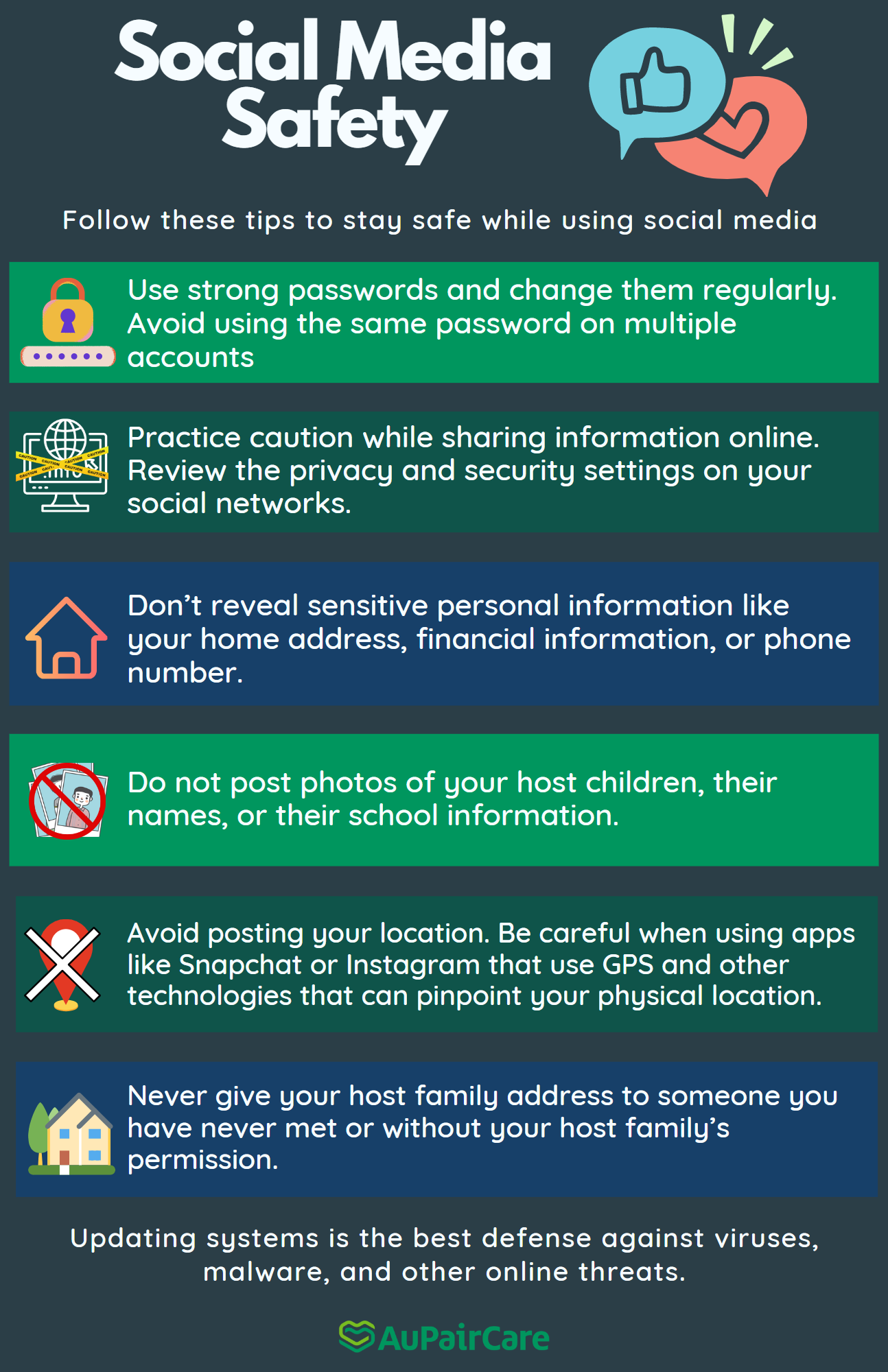 Social media is a great way to share your experiences as an au pair, stay connected with friends and family, and discover new opportunities. However, oversharing or not being mindful of online safety can put both you and your host family at risk. At AuPairCare, we care about your safety, both offline and online.
